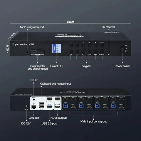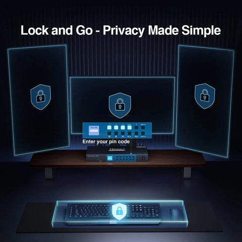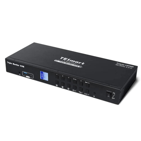 For Triple-monitor Setups: HKS403-P23 - Equipped with multiple USB 3.0 ports (including USB-C with charging functionality), LAN port, and headphone jack. Supports up to 4 computers and up to 3 shared displays, featuring high-resolution (4K@60Hz) output and wide compatibility with 3D, HDR, HDCP, Dolby Vision, and more. Offers flexible operations with multiple switching options and an auto-scan function. The one-key locking KVM function protects your privacy. The user-friendly LCD visual display screen allows for intuitive operation.