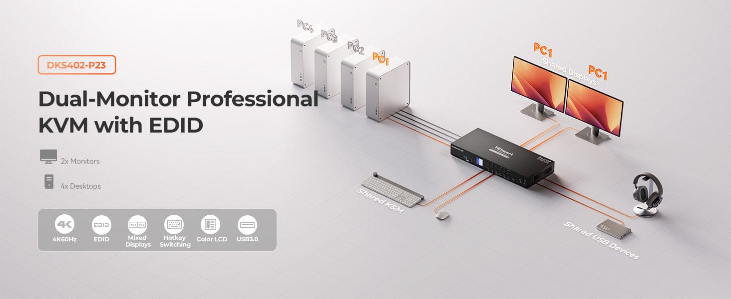 The DKS402-P23 is a dual-monitor KVM switch that supports 4K@60Hz and lets you control 4 computers with one keyboard and mouse. Featuring advanced EDID emulation, it also includes auto-scan to switch displays between active inputs at set intervals.