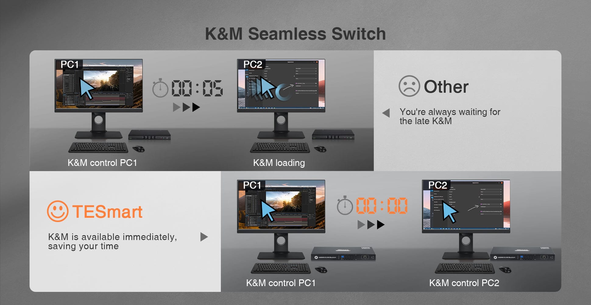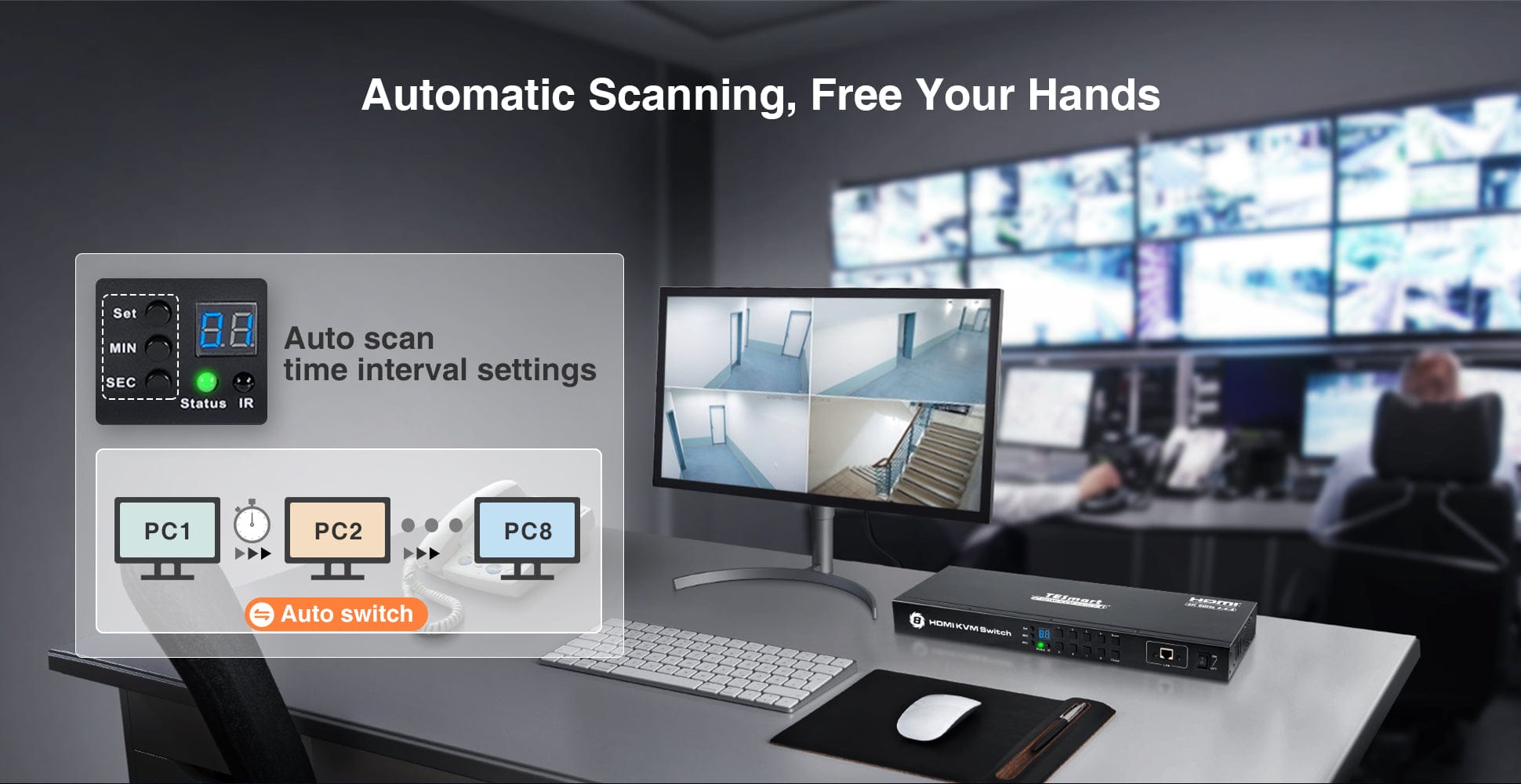 - Support front panel buttons, IR signals, keyboard hot keys, RS232 serial commands or IP commands to control KVM switch.
