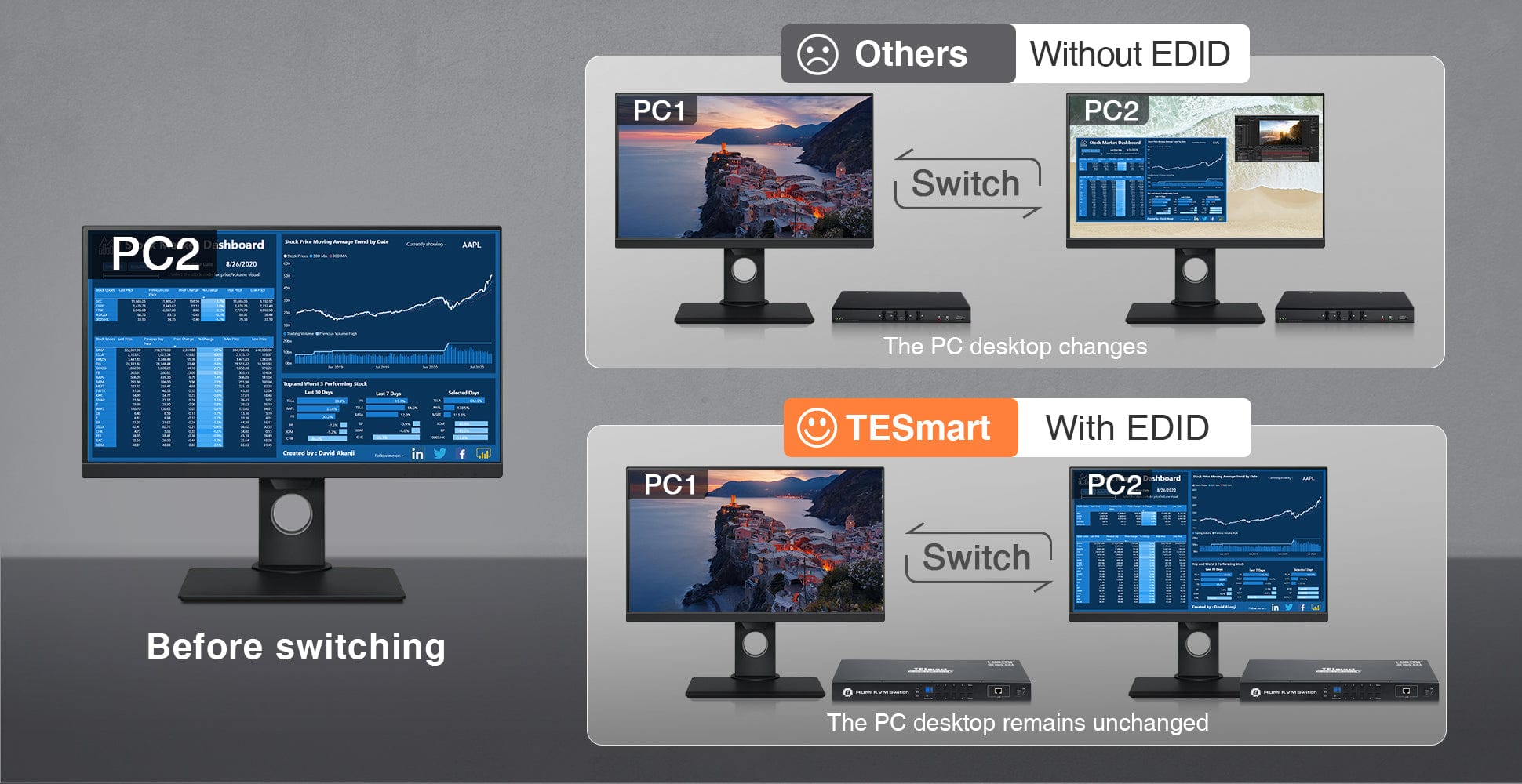 - With EDID emulators in each input port, keep PCs always having correct display information.