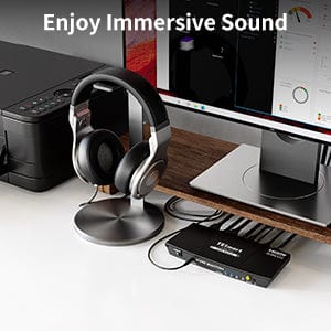 - Transmits audio over HDMI to the monitor and also provides stereo output on the KVM for external speakers.