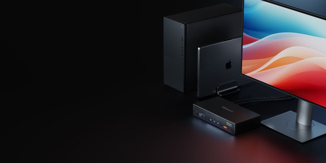 This KVM lets you lock USB 3.0 and L/R audio focus independently, so your headset, webcam, or external drives stay connected to the current PC — even while switching screens.