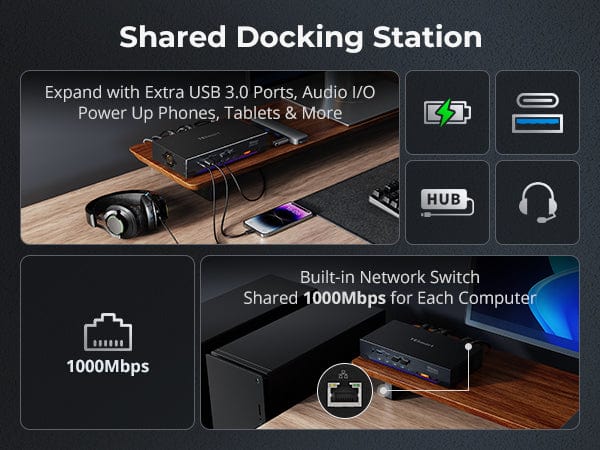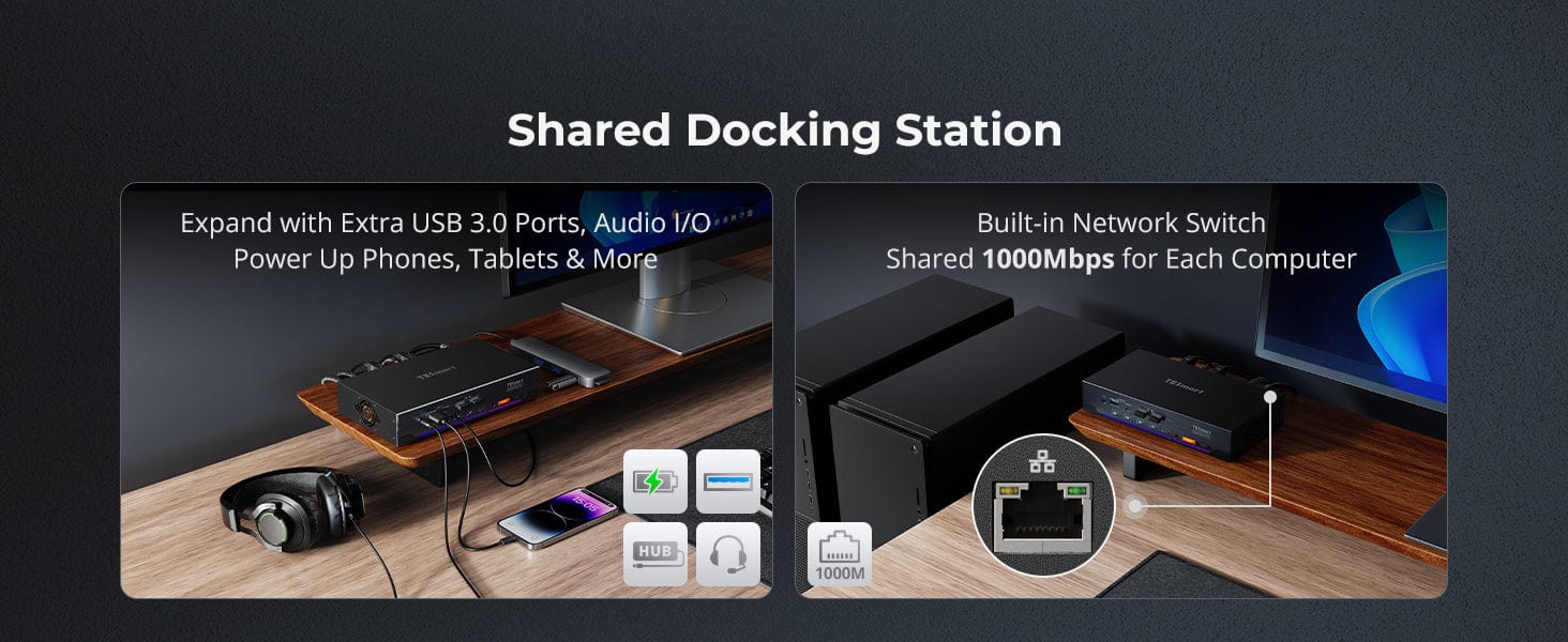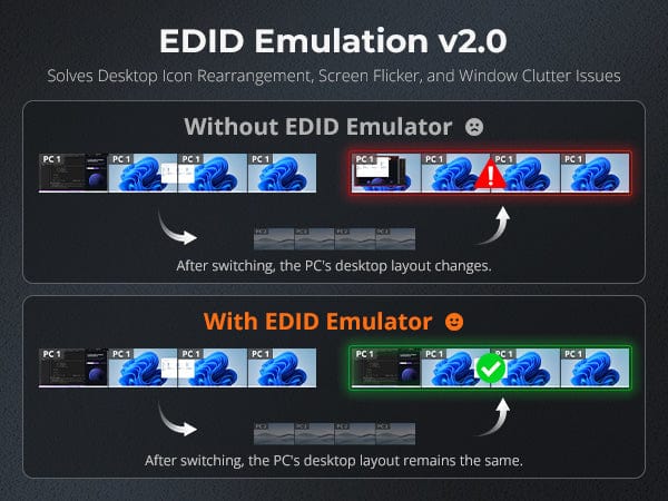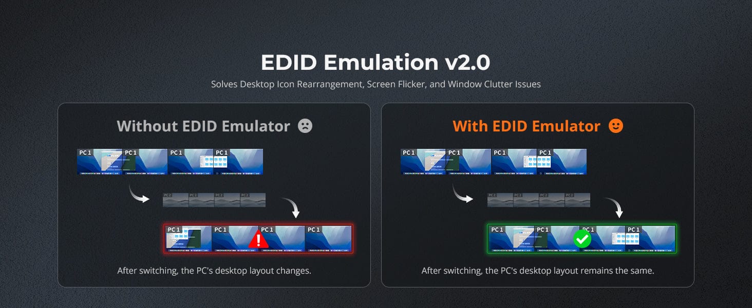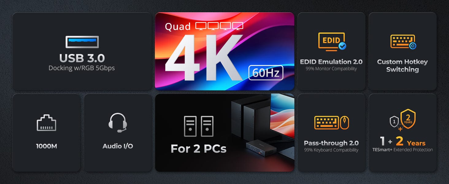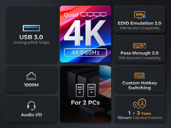 Quad 4K60 HDMI DP KVM Switch - with USB 3.2 Hub, Gigabit LAN & EDID for 2 PC Workstation