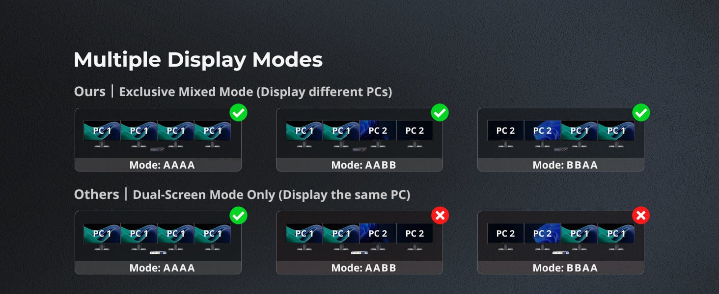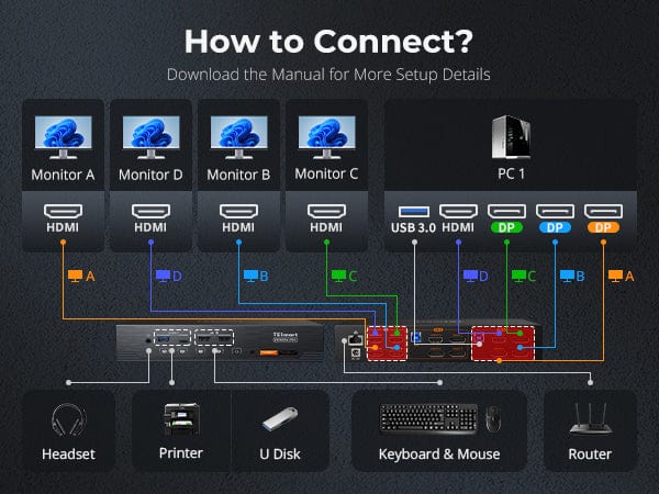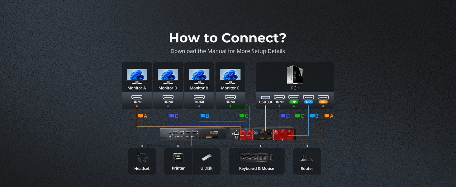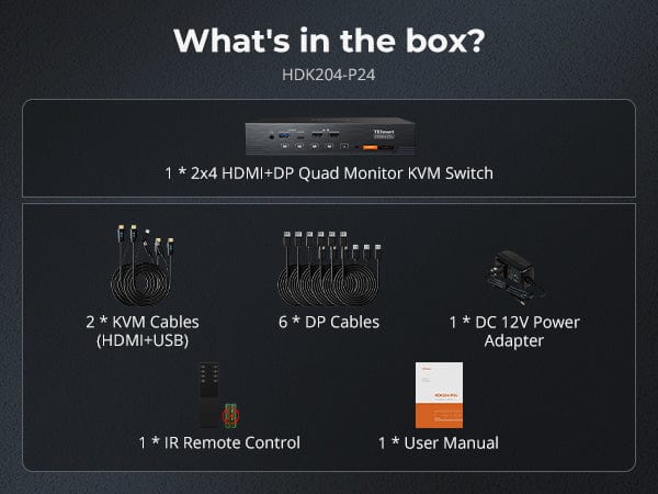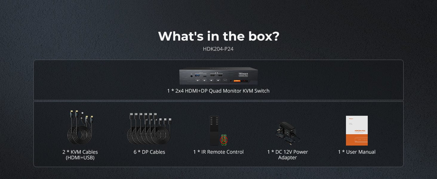 - 1 * 2x4 HDMI+DP Quad Monitor KVM Switch