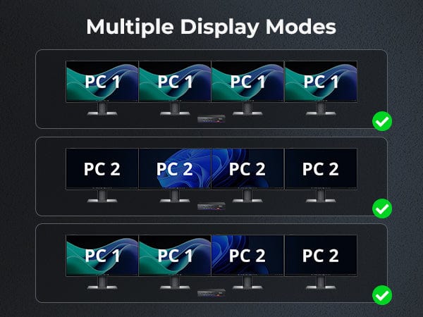 The HDMI 2.0 & DP 1.2 kvm switch kit comes with complete kvm-to-pcs cables (2 * KVM Cables & 6 * DP Cables) for a complete setup.