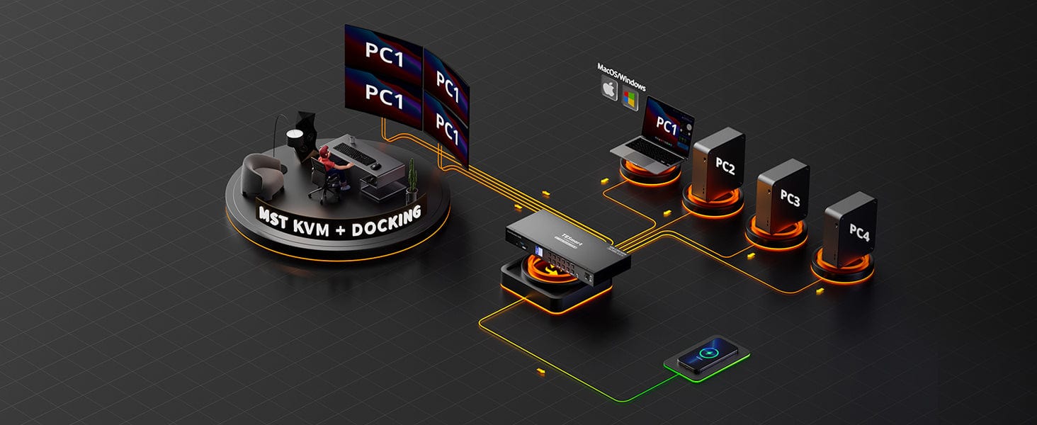 Experience the magic of MST with our KVM switch. You can connect up to four monitors using just one HDMI and one DP with MST. This eliminates the need for additional docks, simplifying your setup and saving you space.