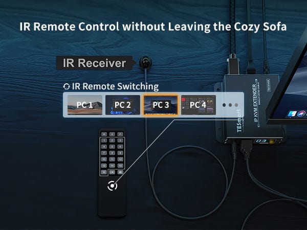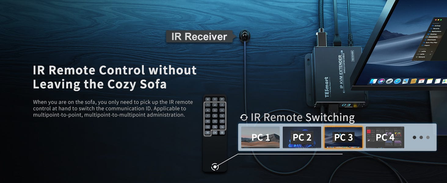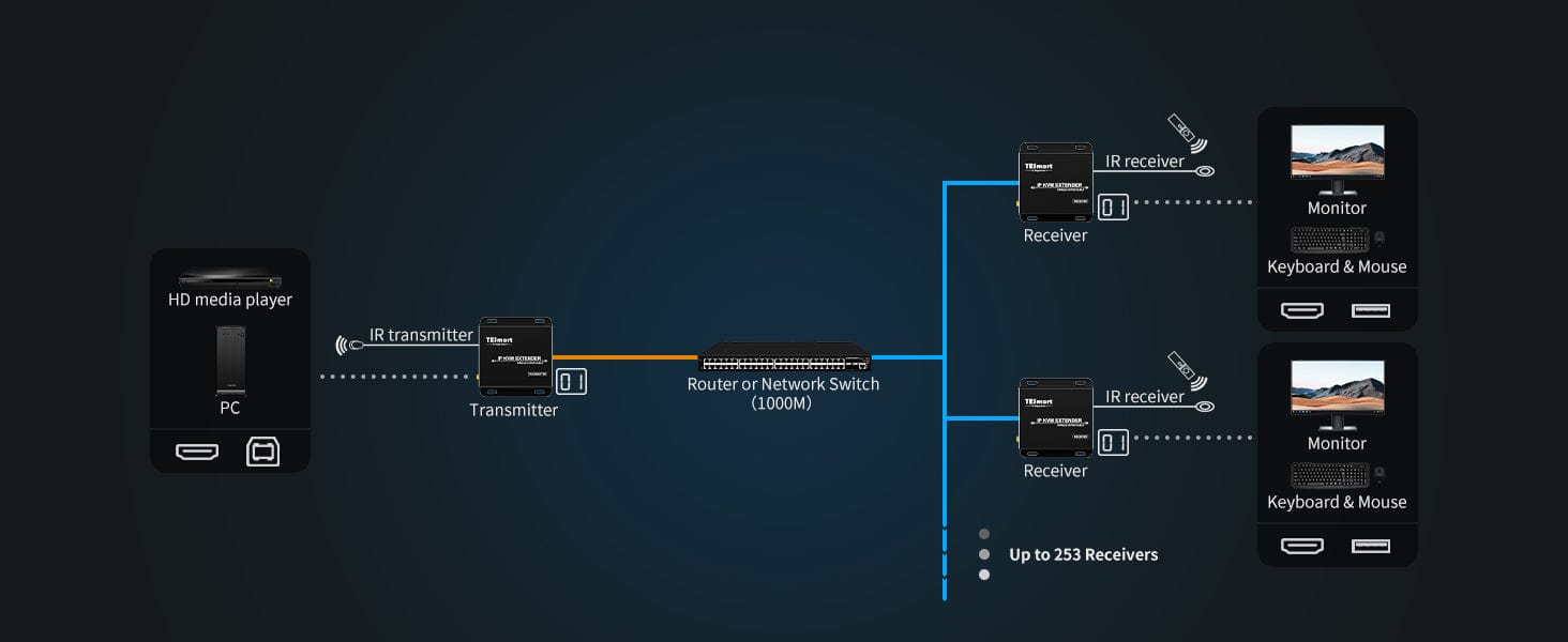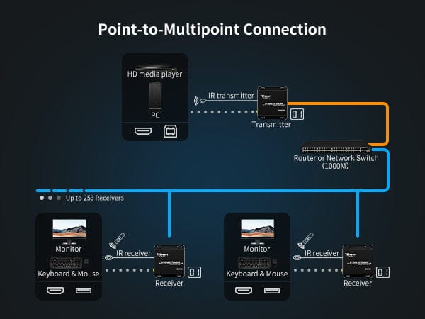 The 120M HDMI KVM Many to Many Over IP Extender with IR (HKE12MMA10), Support USB keyboard and mouse data, IR signal transmitted over a LAN (Local Area Network). Support input resolution up to 1080P Full HD. According to 1000M IGMP network switch, source content can be transmitted from several transmitters (Up to 16 transmitters) to several receivers (Up to 253 receivers) over LAN, and the transmitter can be controlled by either of the receivers in the same local area network by IR or USB keyboard and mouse. This product can be used on remote DVR for Security System, servers in data centre and monitor room.