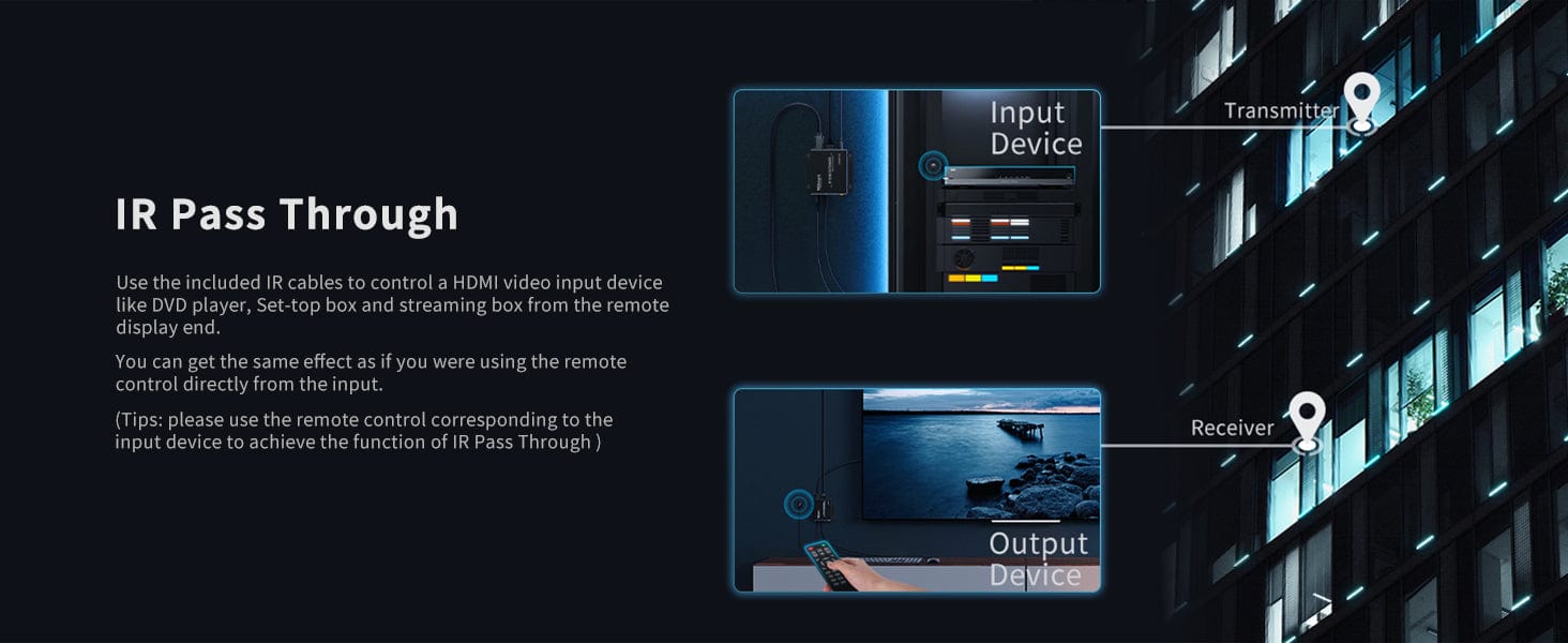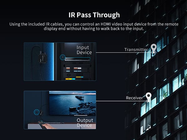 - With IR pass though, the playback device can be remotely controlled at the receiving end via UTP/FTP cable.