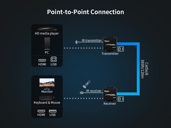 - Support 1920x1080@60Hz resolution transmission via UTP/FTP cable up to 120 meters.