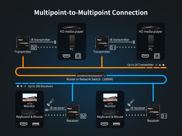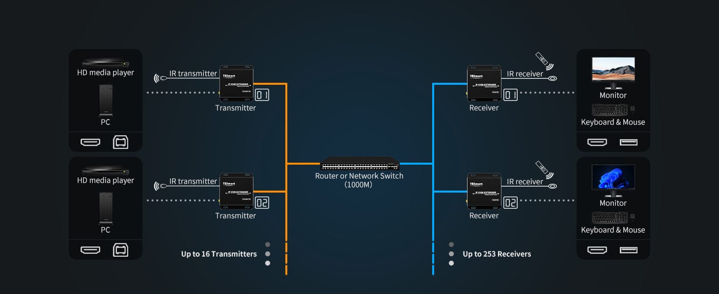 - Routes up to 16 transmitters to 253 receivers by 1000M IGMP network switch.