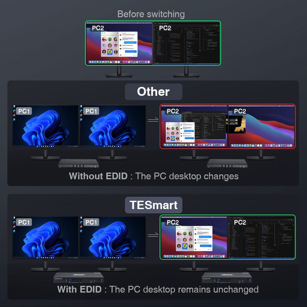 Never worry about display issues again.Our KVM Switch with EDID emulation ensures that your computers always receive the correct display information, providing a seamless and worry-free experience.