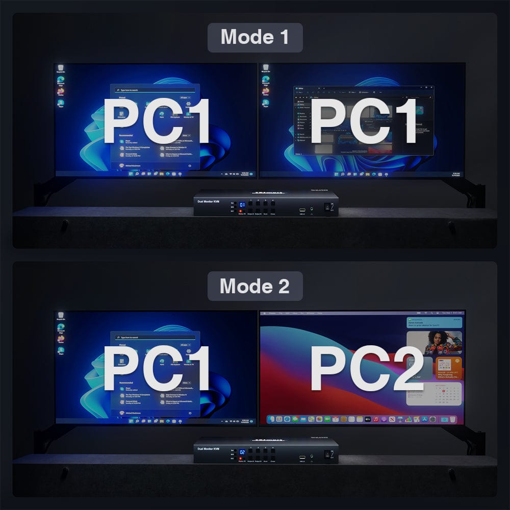 • 2 Operating Modes: Mode 1 for extended desktop and Mode 2 for split desktop (each computer displays on 1 monitor simultaneously).