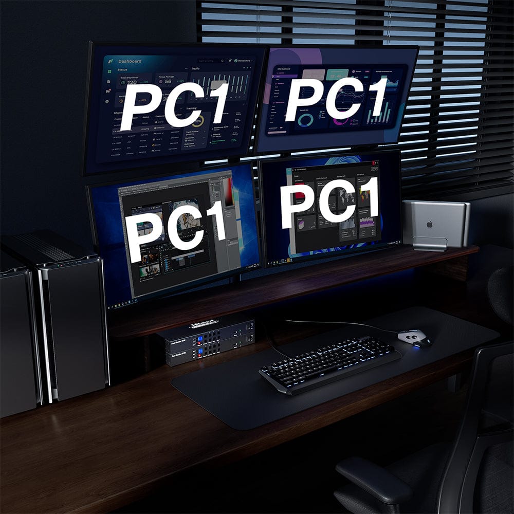 • Efficiently manage 4 PCs with a set of keyboard, mouse, and dual 4K60Hz displays.