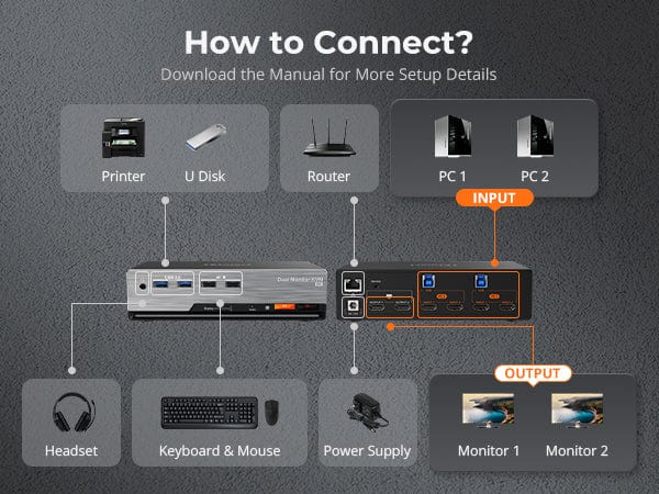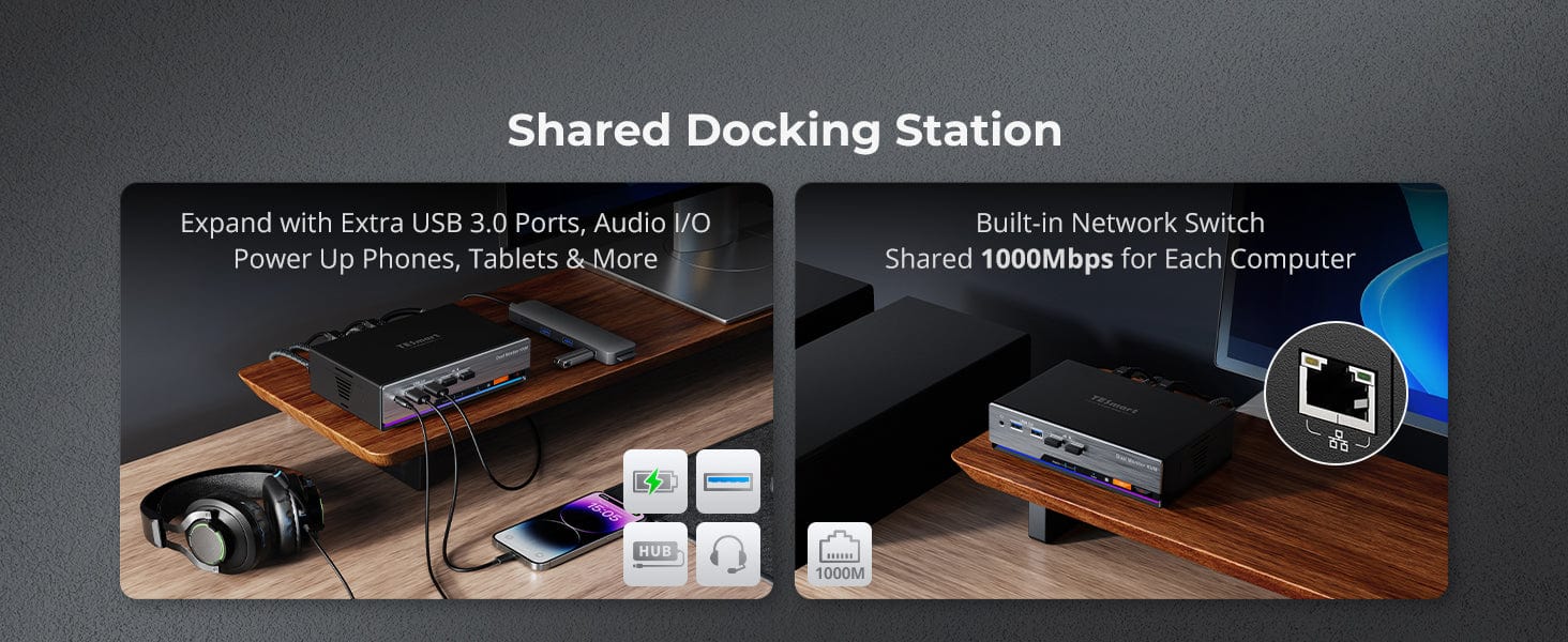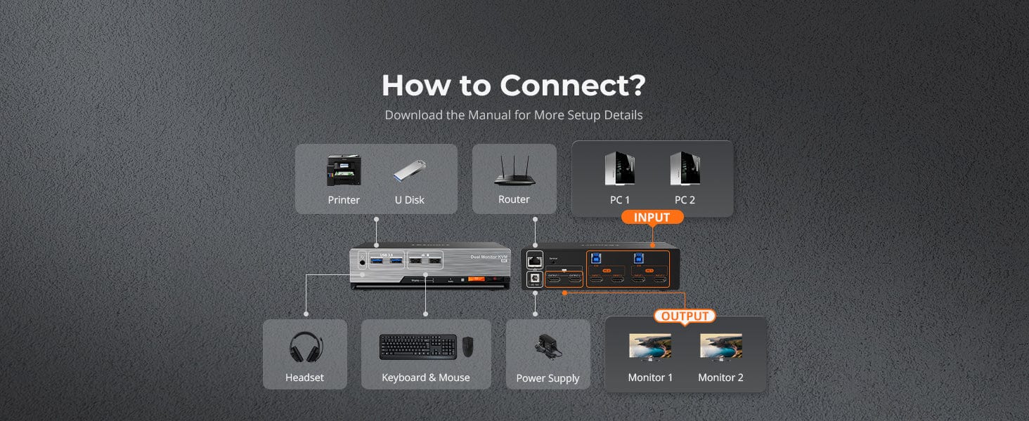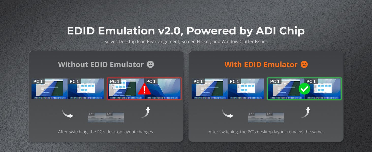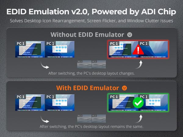 This KVM supports 2pcs & 2 monitors with HDMI 2.1 8K@60Hz lets you say goodbye to screen hassles and take control of your dual-computer setup! Advanced EDID technology ensures no window resets or sudden file pop-ups when switching between computers, while also solving the issue of tangled cables and cluttered desktops. Multiple seamless switching options make it perfect for your diverse needs, whether for work, creativity, or gaming.
