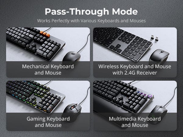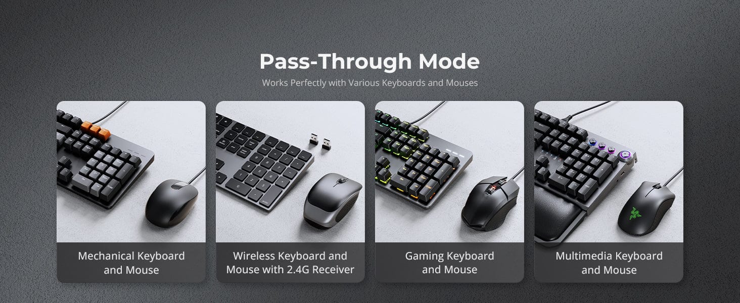 The HKS202-M24 models support both pass-through mode and legacy emulation mode for keyboard and mouse control. For pass-through mode, it features good compatibility with the mainstream keyboards and mice on the market. However, with the iterative upgrading of the keyboards and mice, it is inevitable that there will be some special models of keyboard and mouse which may have potential compatibility issues with our KVM, therefore, to get better compatibility experience, it is available to turn to legacy emulation mode.