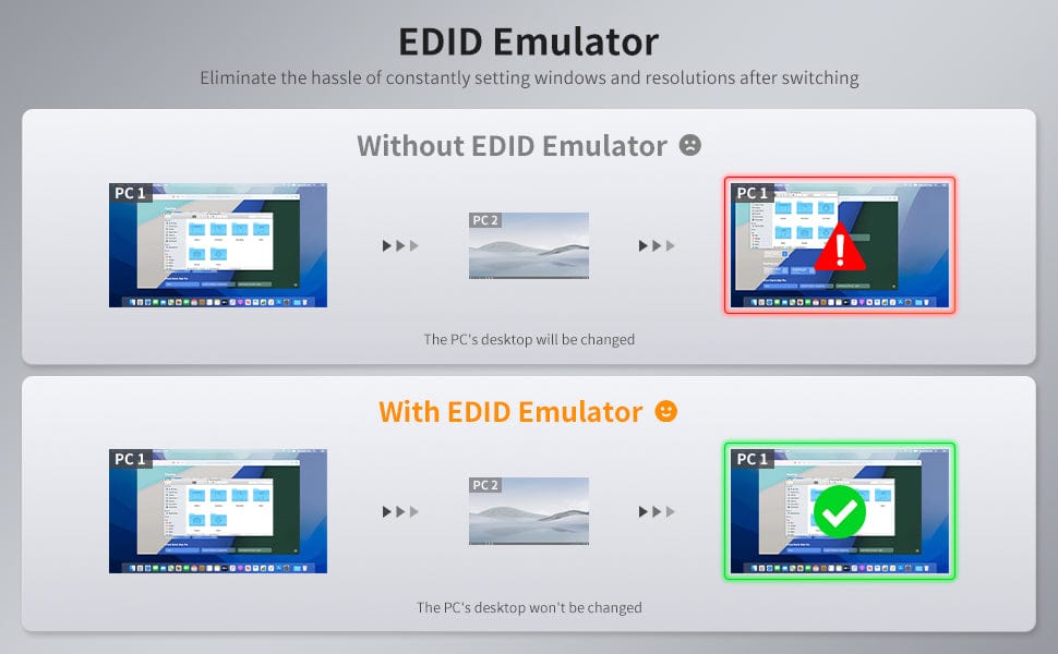 - Exceptionally compatible, thanks to its pass-through mode, this KVM works seamlessly with a variety of gaming keyboards and illuminated keyboards, surpassing other KVM switches that rely on USB emulation.