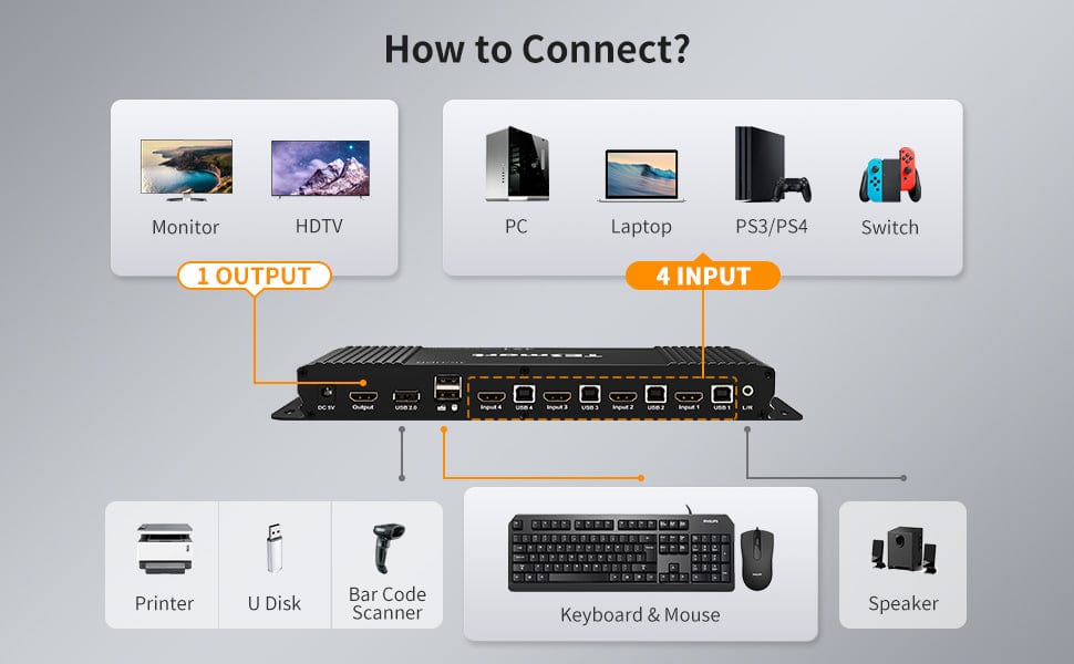 - Connect and switch with non-PC devices such as gaming consoles, streaming boxes, NVRs, etc.
