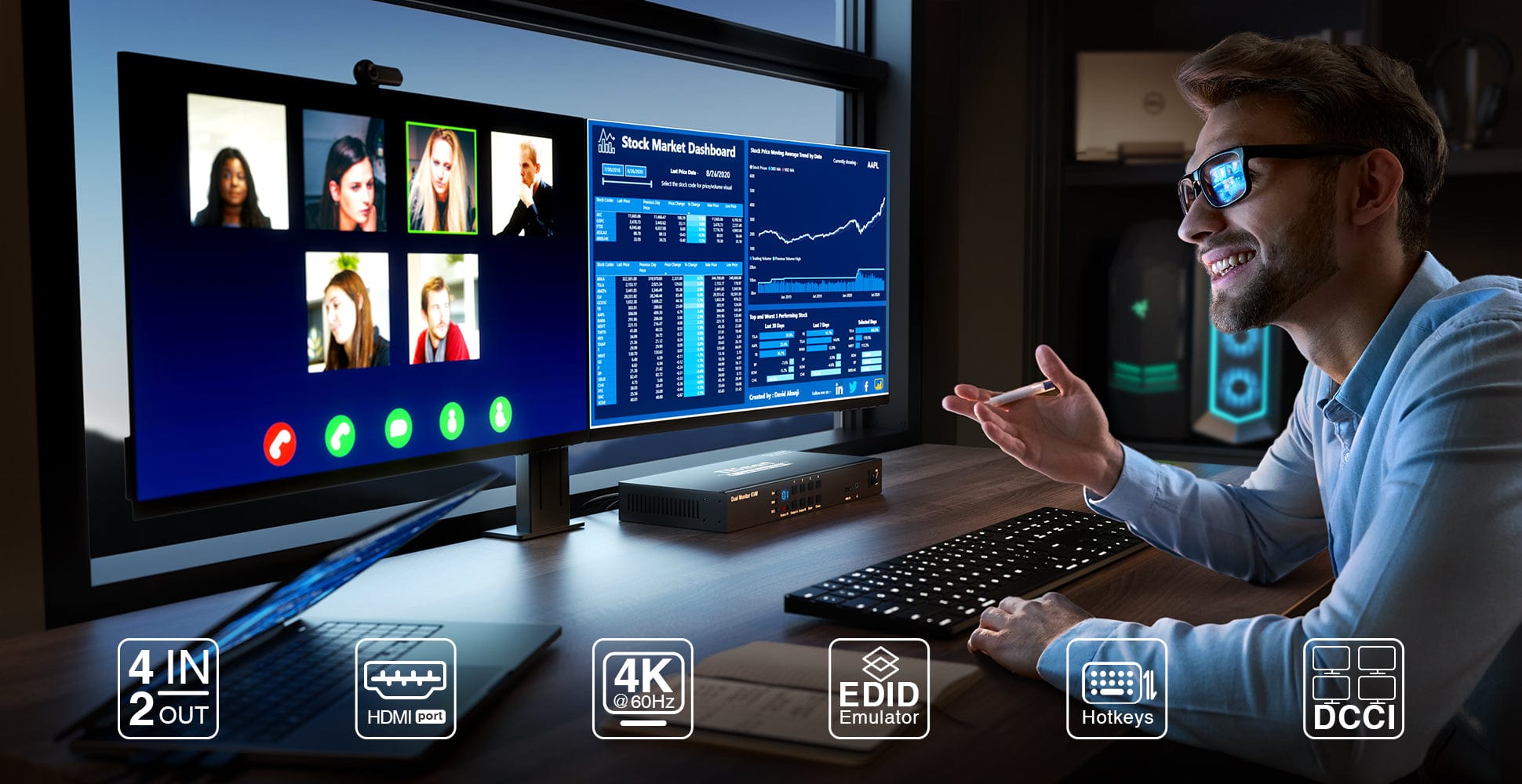 - Efficiently manage 4 PCs with a set of keyboard, mouse, and dual 4K30Hz displays.