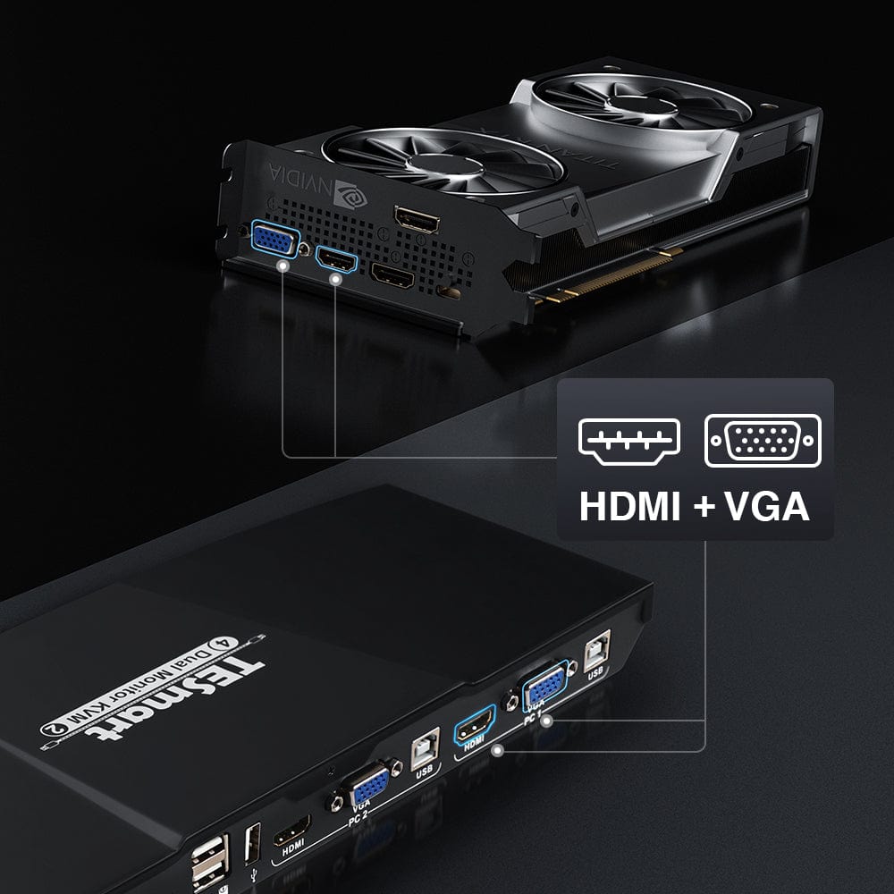 - Connect each PC to this KVM switch with one HDMI and one VGA output for dual-monitor functionality.