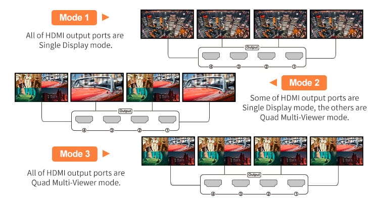 - Supports two different resolutions in Quad Multi-Viewer mode: 720P60Hz or 1080P60Hz.