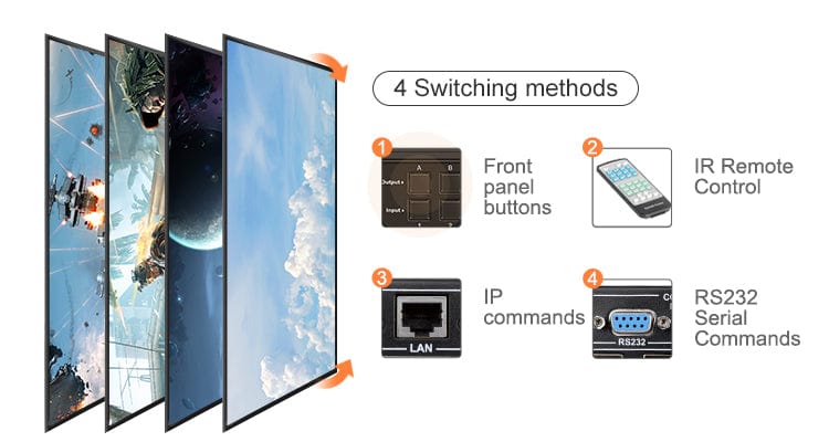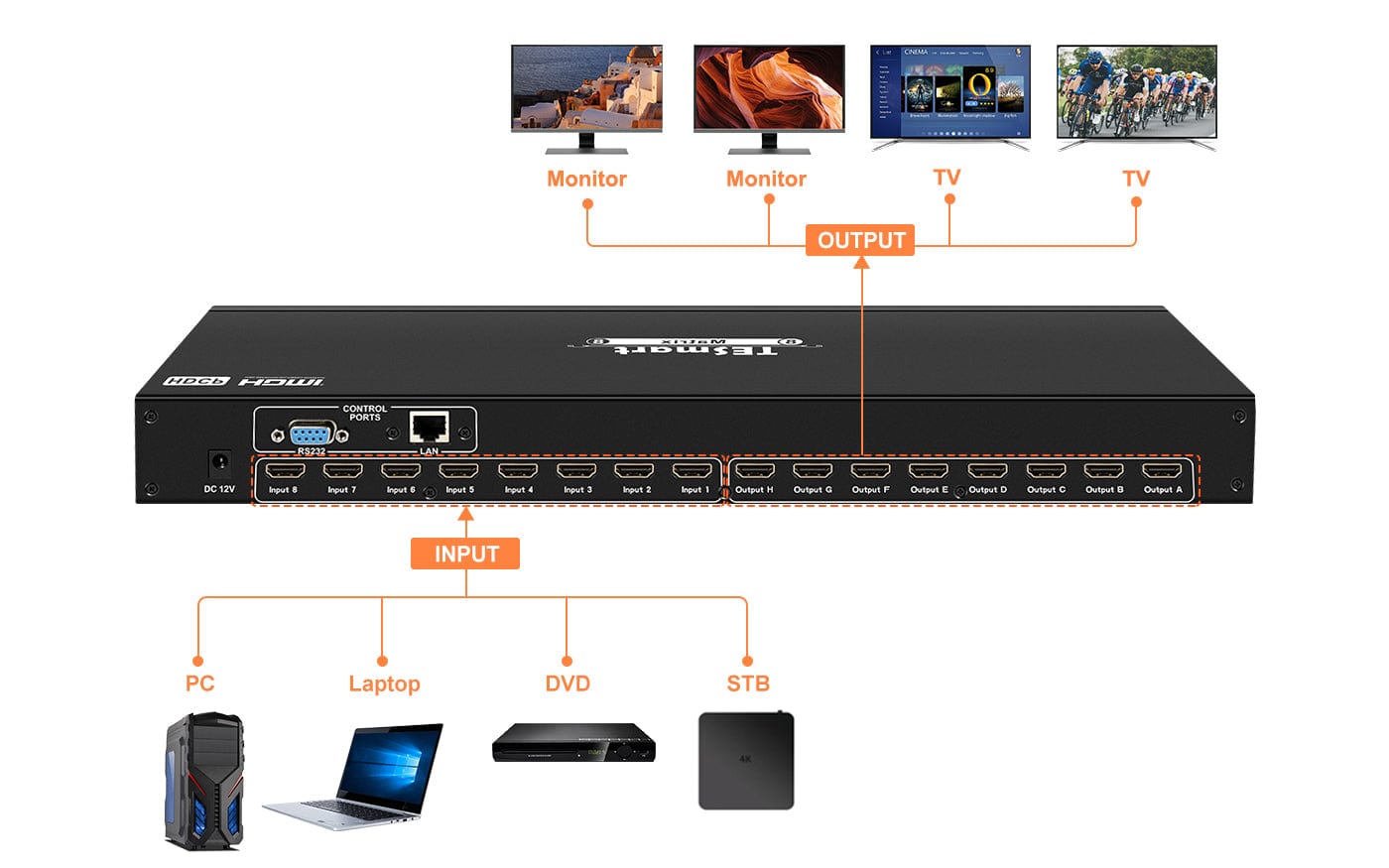 This 8x8 HDMI matrix routes 8 Ultra HD sources to eight 4K Ultra HD displays with HDMI inputs. Each source can be routed to any display, using the front-panel buttons or the IR Remote Control. The matrix can also be controlled via RS-232, IP interface. With smart EDID management, make it compatible with most of the HDMI source and sink devices.