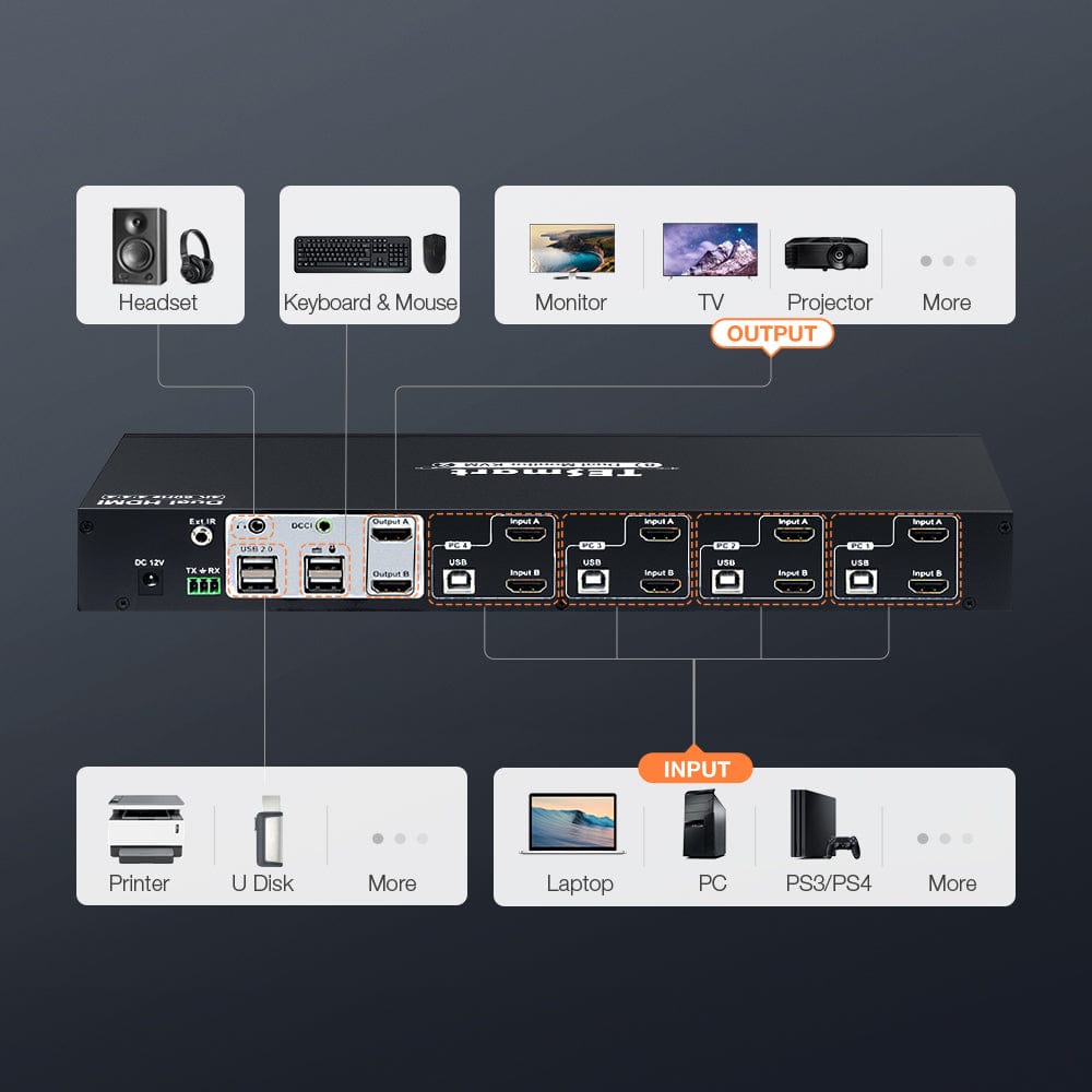 - Efficiently manage 4 PCs with a set of keyboard, mouse, and dual 4K60Hz displays.
