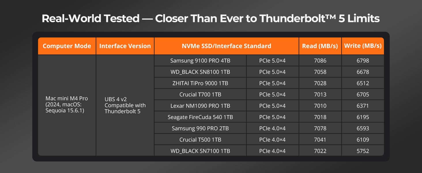 - Tested with Samsung 9100 Pro, WD SN8100, TiPro 9000, Crucial T700, Lexar NM1090 Pro, Samsung 990 Pro and more — including Apple M4 Series (MacBook Pro / Mac mini) for full-speed stability